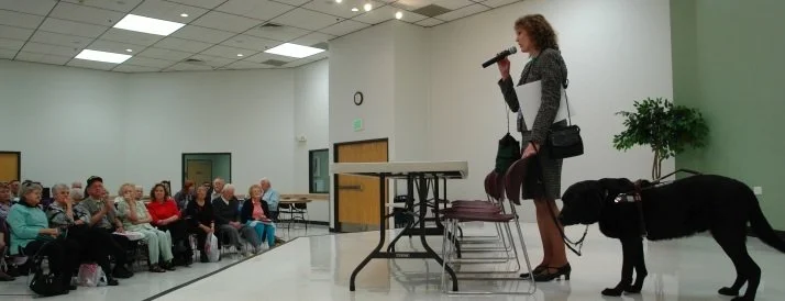 Image: Best Gustin stands in front of a group of people with her guide dog, speaking into a microphone, during a Beyond Vision training.