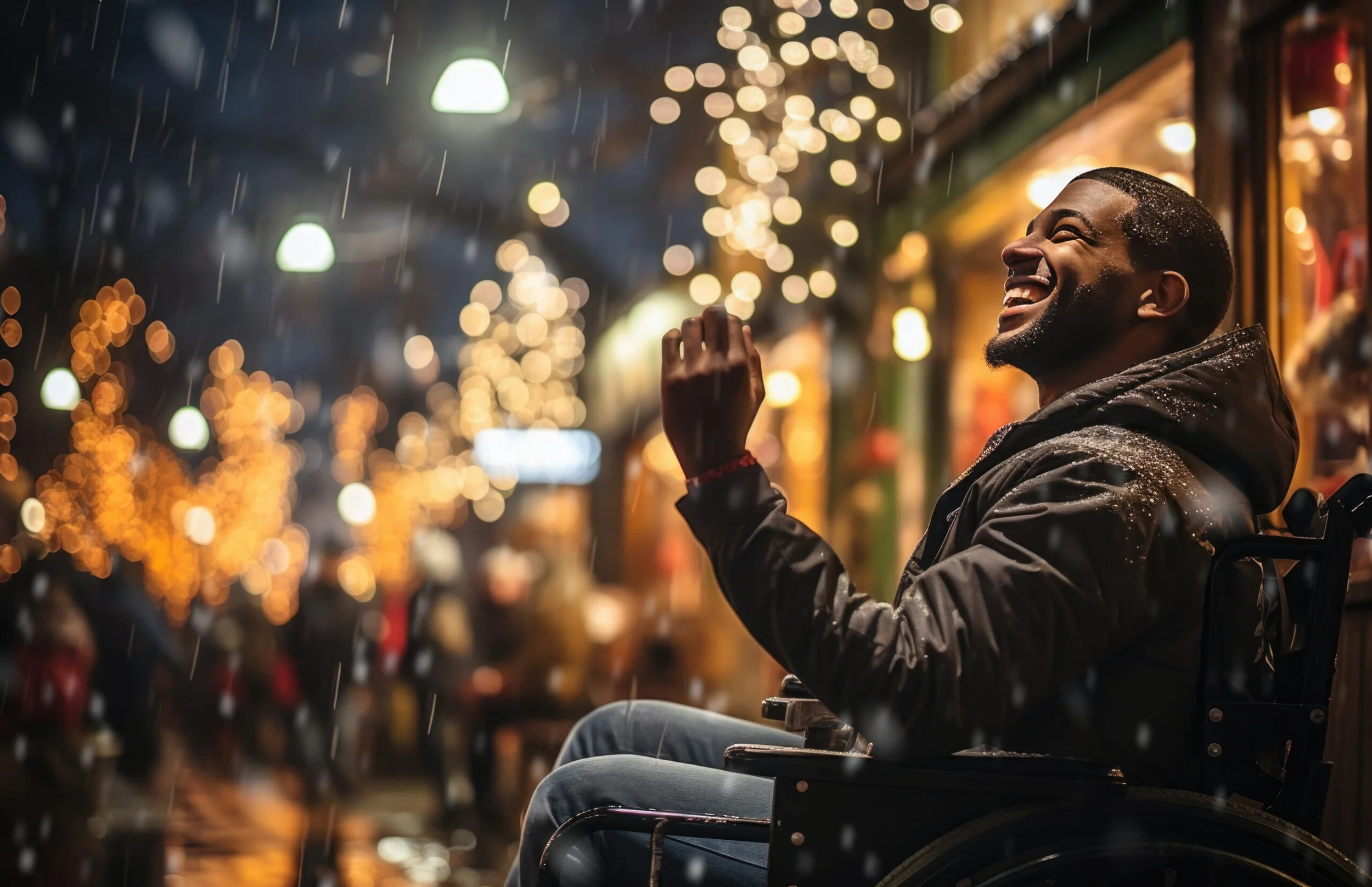 A man who is a wheelchair user smiles while looking up at the snow. Holiday lights are in the background.