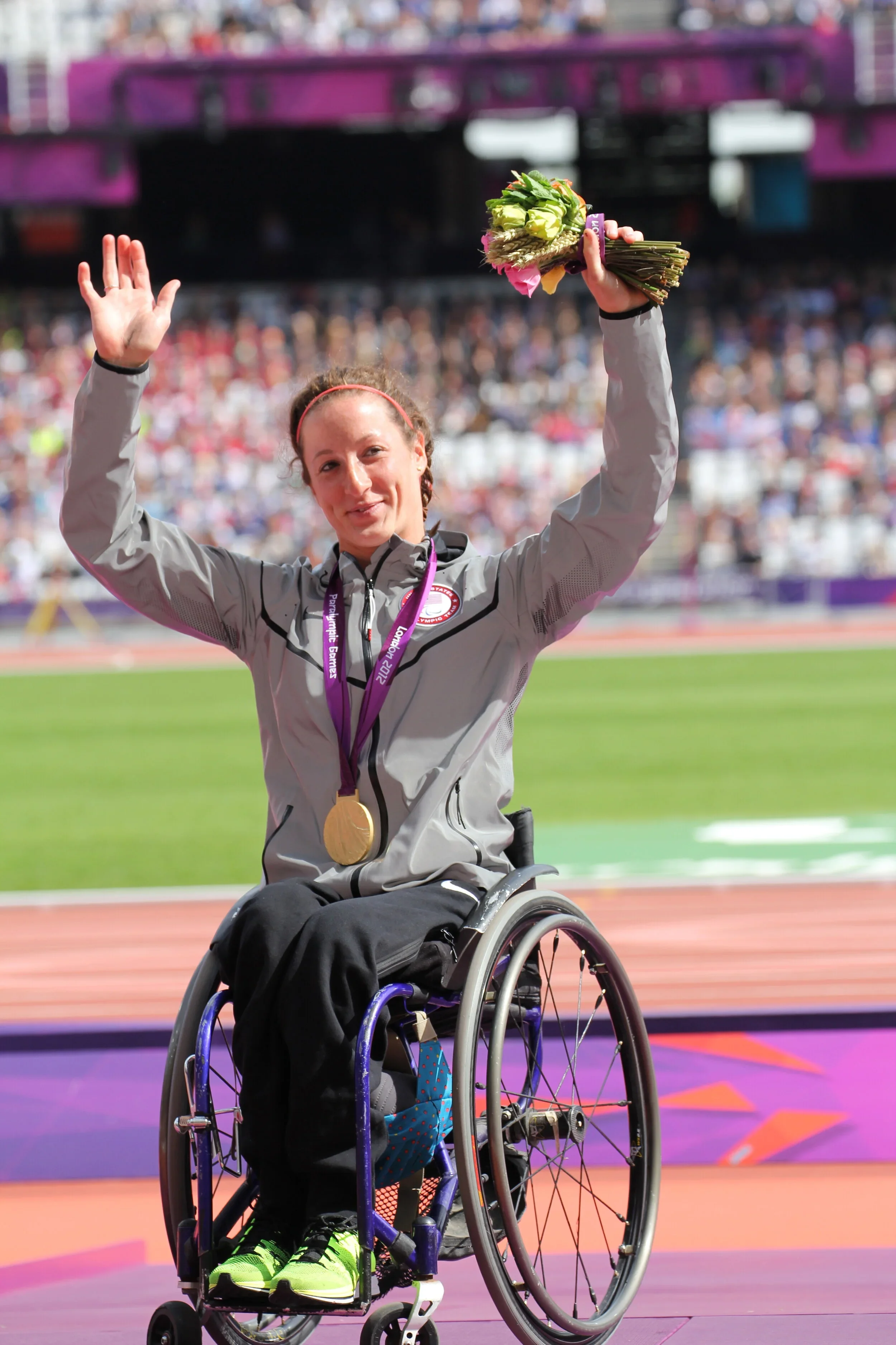 Image: Tatyana McFadden is pictured at the 2012 London Olympics medal ceremony, where she received her gold. She sits in her wheelchair, waving her arms to the crowd, with a bouquet of flowers in her hand. Her medal is around her neck.