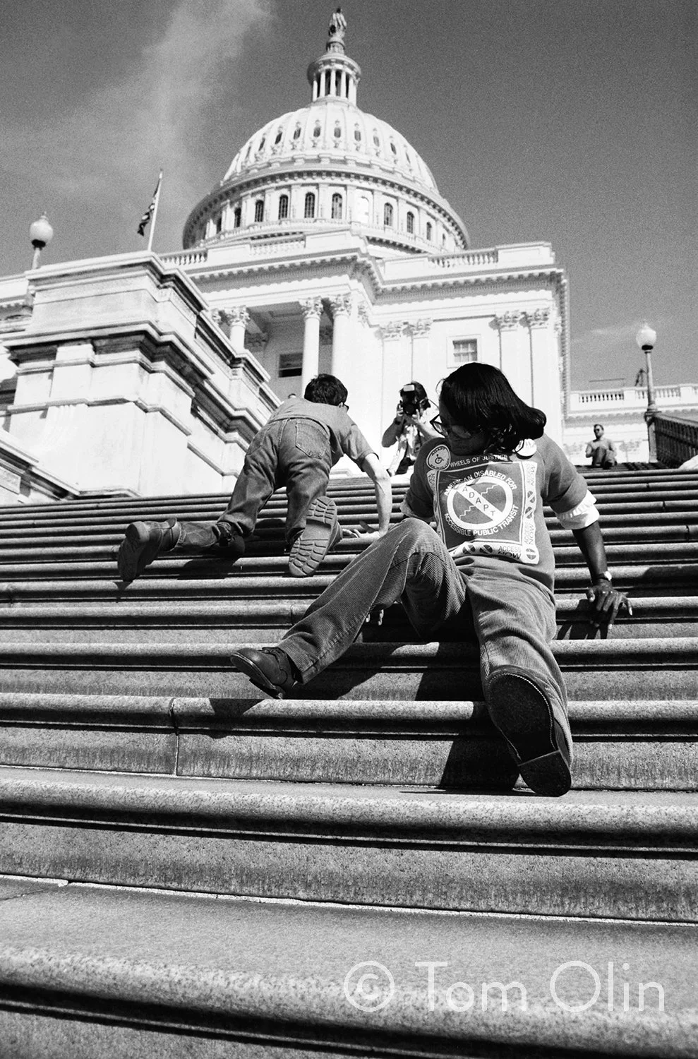 Image: Taken at the 1990 Capitol Crawl, several people with disabilities are seen crawling up the stairs at the Capitol.