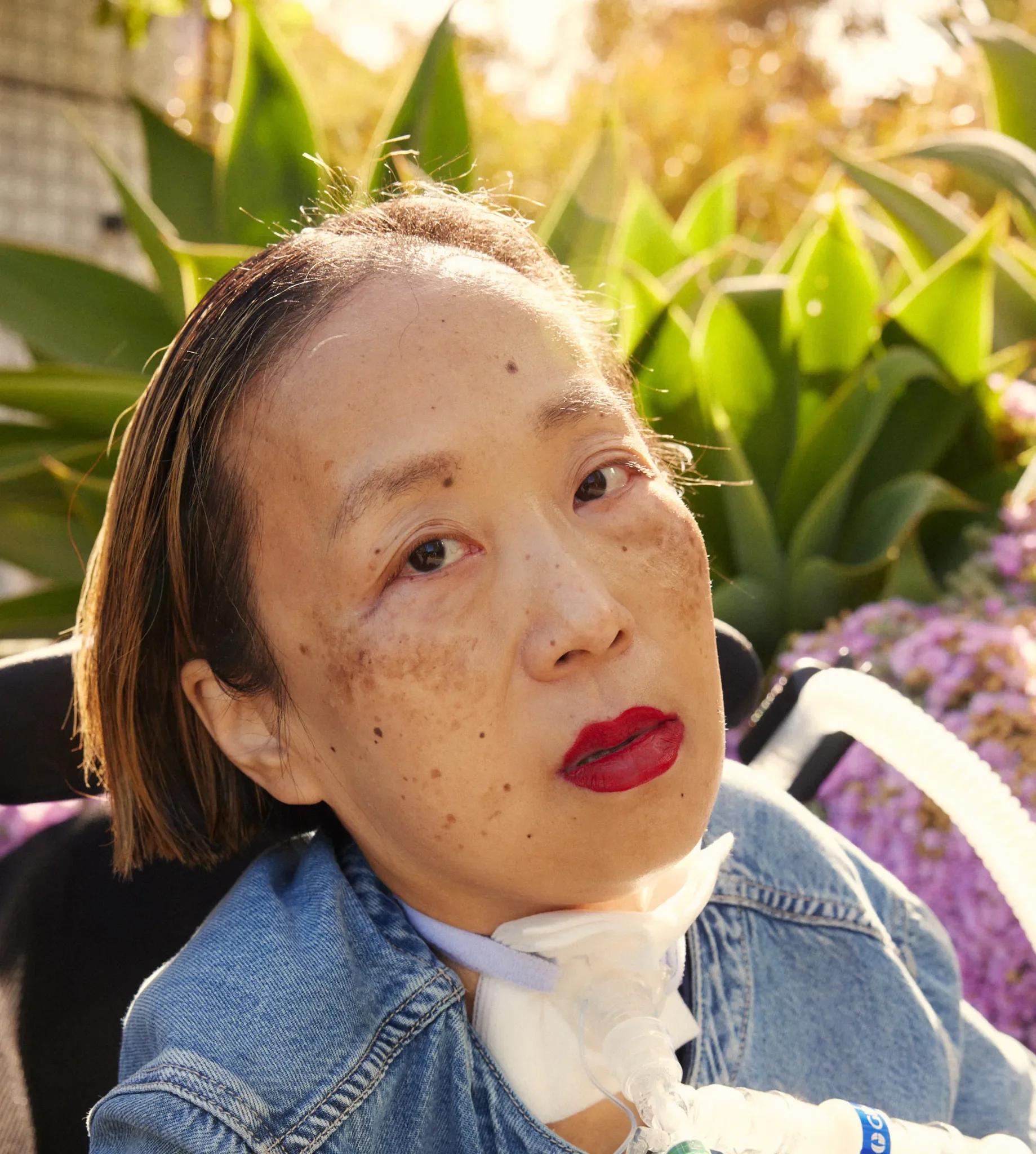 Image: Alice Wong, an Asian American disabled woman with a tracheostomy at her neck. She is wearing a bright red lip color and a denim shirt. She is looking intently into the camera and the sun is shining behind her with a bunch of plants. Photo credit: María del Río