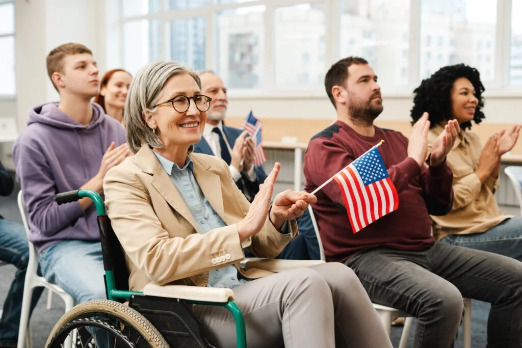Group of multiracial naturalized US citizens at citizenship ceremony. A smiling senior woman in wheelchair holds an American flag.
