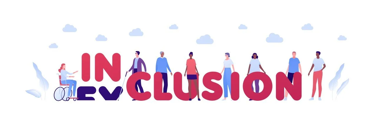 Image: The word exclusion with the first part "ex" rolling off while the letters "in" roll in to change it to inclusions. Also drawings of people with different abilities and ethnicities behind the letters