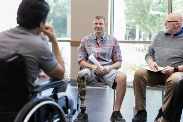 Adult male veteran with a prosthetic leg talks with a wheelchair user and another older man