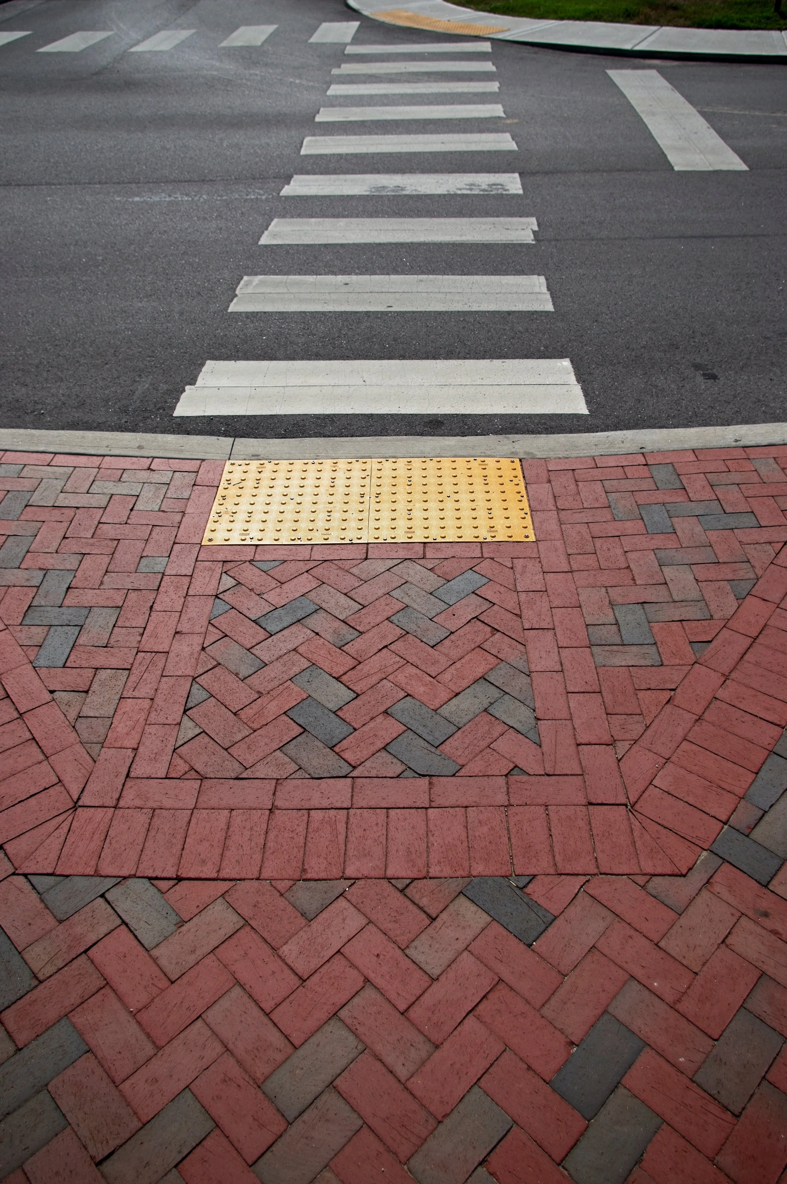 Image: A brick sidewalk ends at the street with an accessible curb cut.