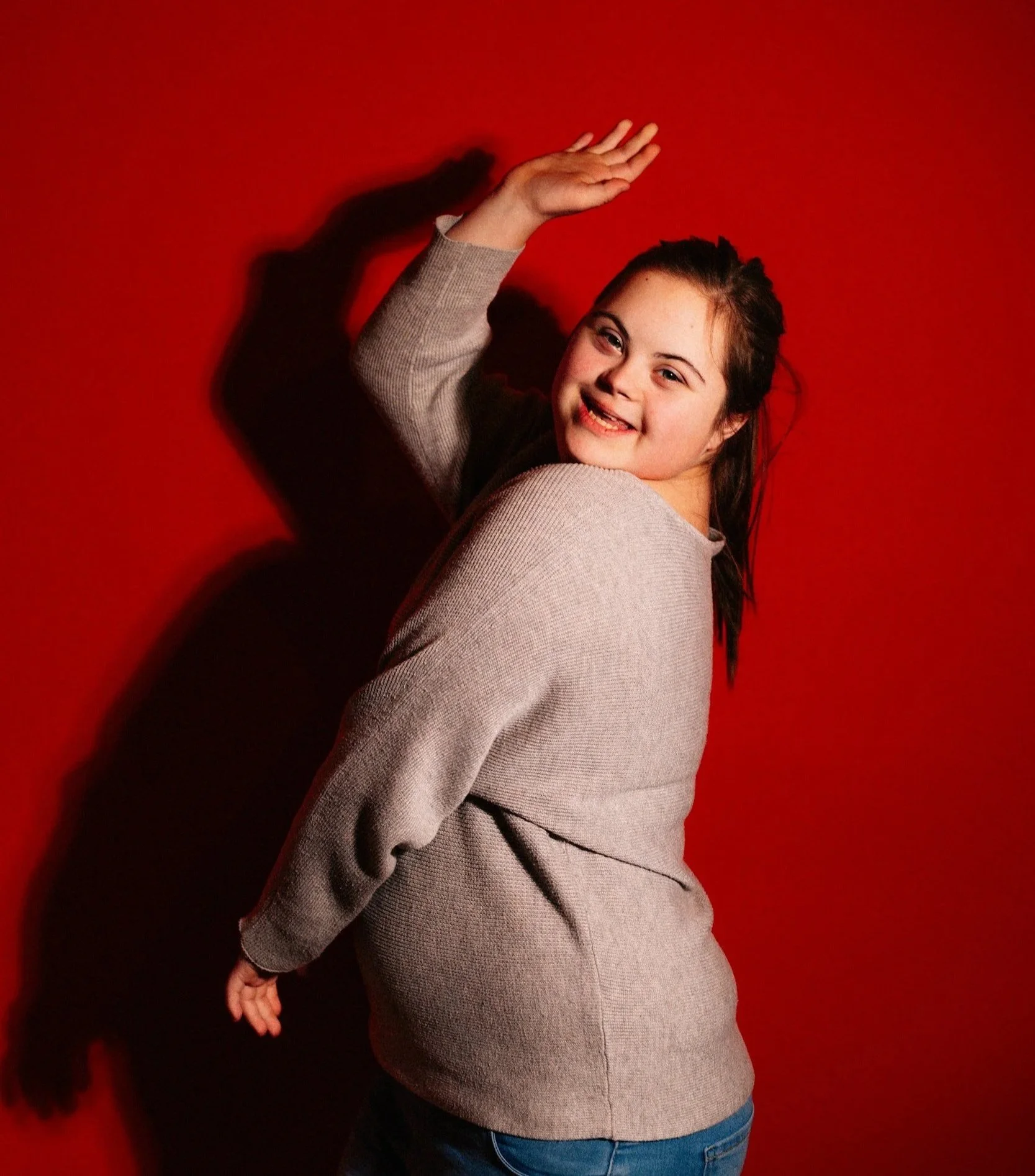Image: A young woman with Down’s Syndrome smiles and poses for the camera.