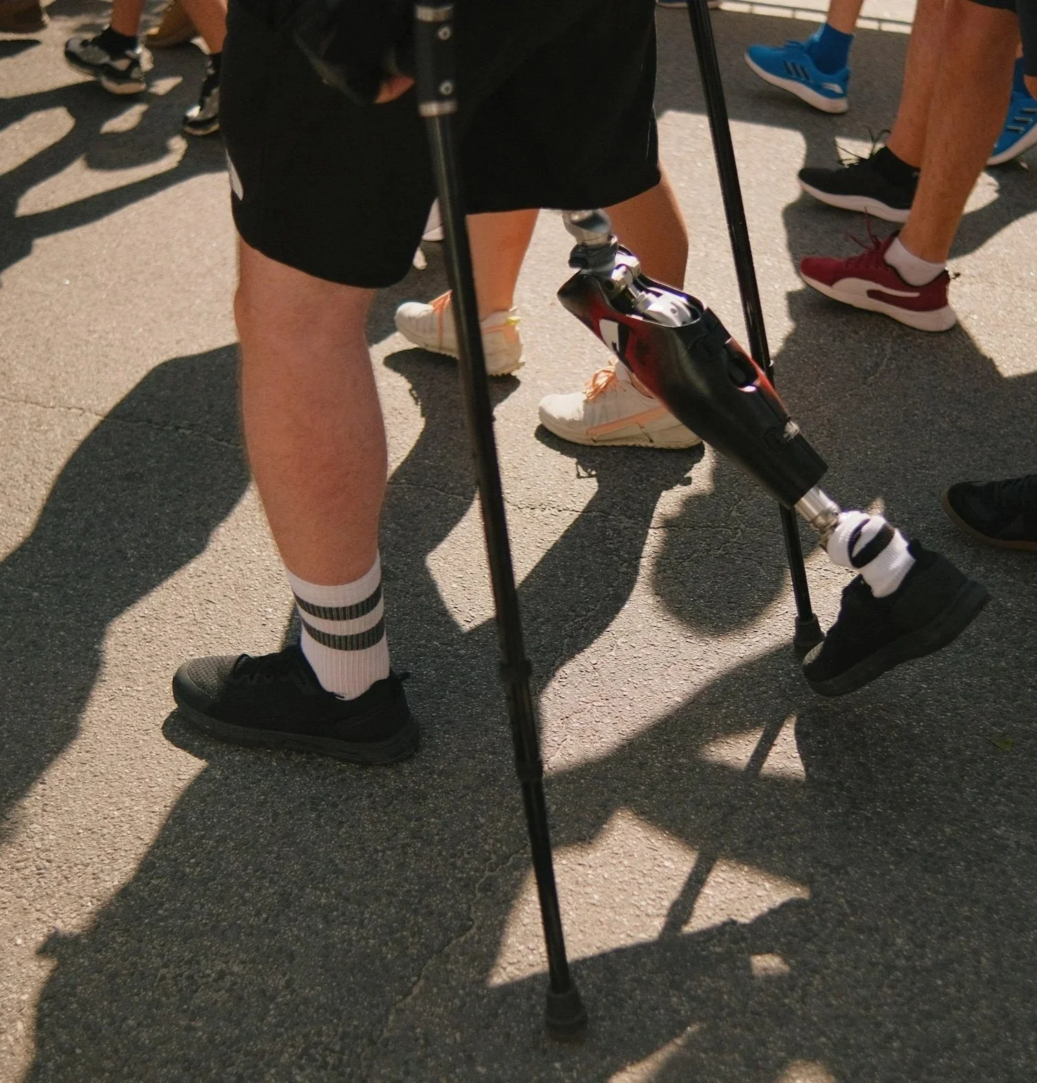 Image: A person is pictured from the waist down walking with a prosthetic leg and crutches.