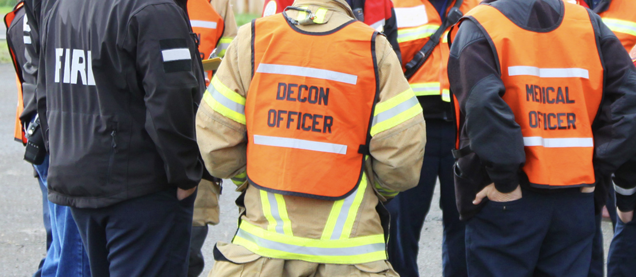 Image: Members of the Medical Reserve Corps of Boulder County are pictured from behind, wearing reflective vests with their job title written on the back, such as “Medical Officer”, “Decon Officer”, and “Fire”.
