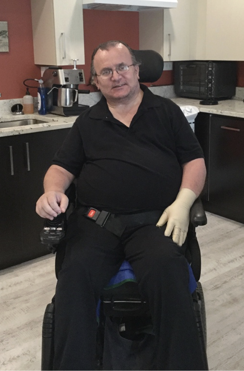 Image: Luca, a participant in the STEP program, is pictured sitting in his electric wheelchair as he moves into his new apartment.